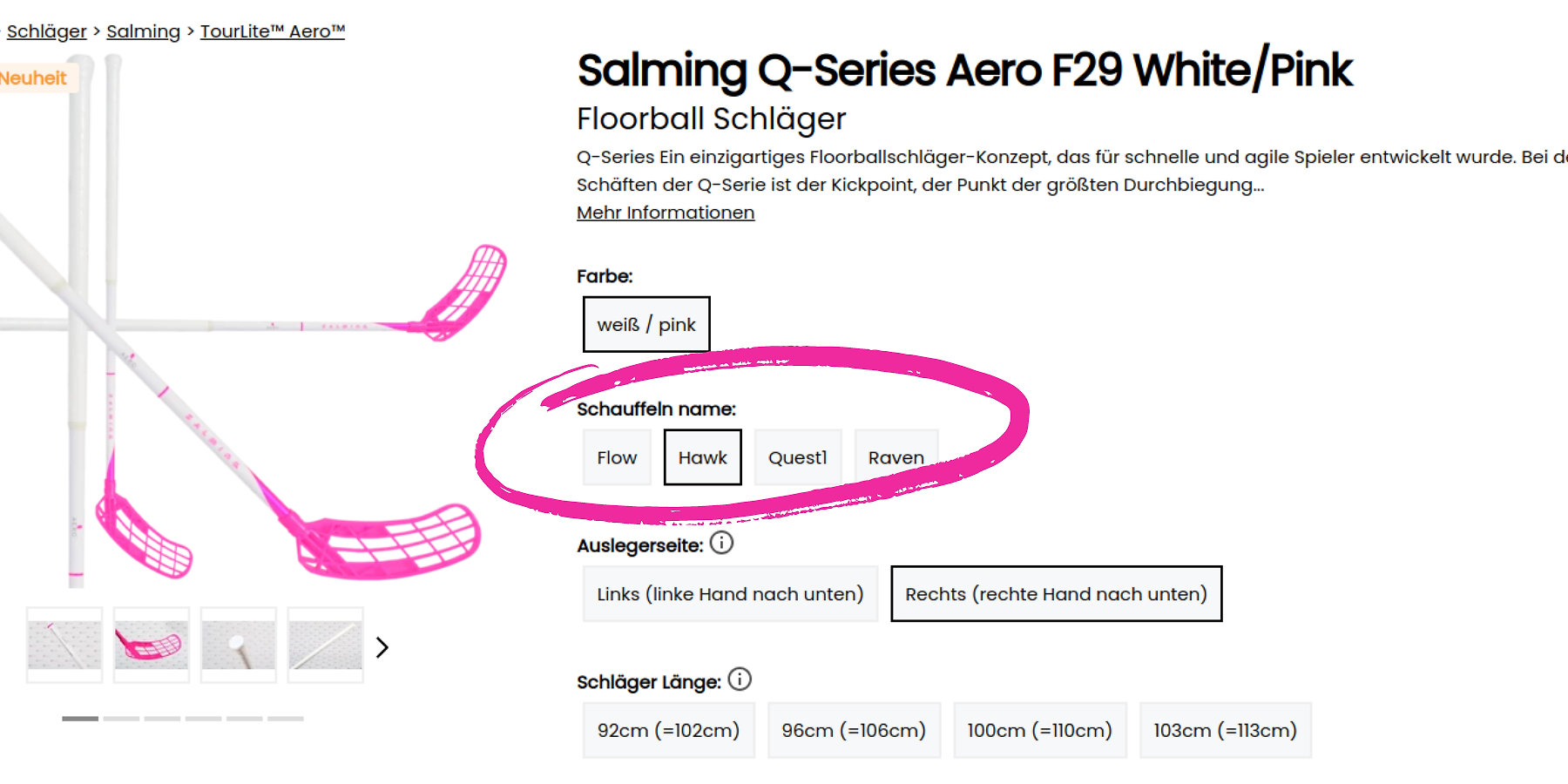 Da die meistverkaufte Farbe der Salming-Klingen schwarz und rosa ist, stehen nur diese beiden Farben zur Auswahl. Auf jeden Fall passen diese beiden Farben perfekt zu den neuen Schäften! Wenn Sie eine andere Farbe der Klinge wünschen, schreiben Sie es uns in den Anmerkungen beim Erstellen einer Online-Bestellung und wir werden versuchen, unser Bestes für Ihren Traumstock zu tun.