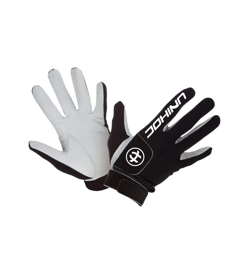 Super cool ist der abgerundete Teil mit einem weiß gestickten Unihoc-Abzeichen. Dies ist die Befestigung der Handschuhe, mit der Sie die Breite des Handschuhs regulieren können. Sie passen die Handschuhe einfach etwas besser an Ihre Hände an.