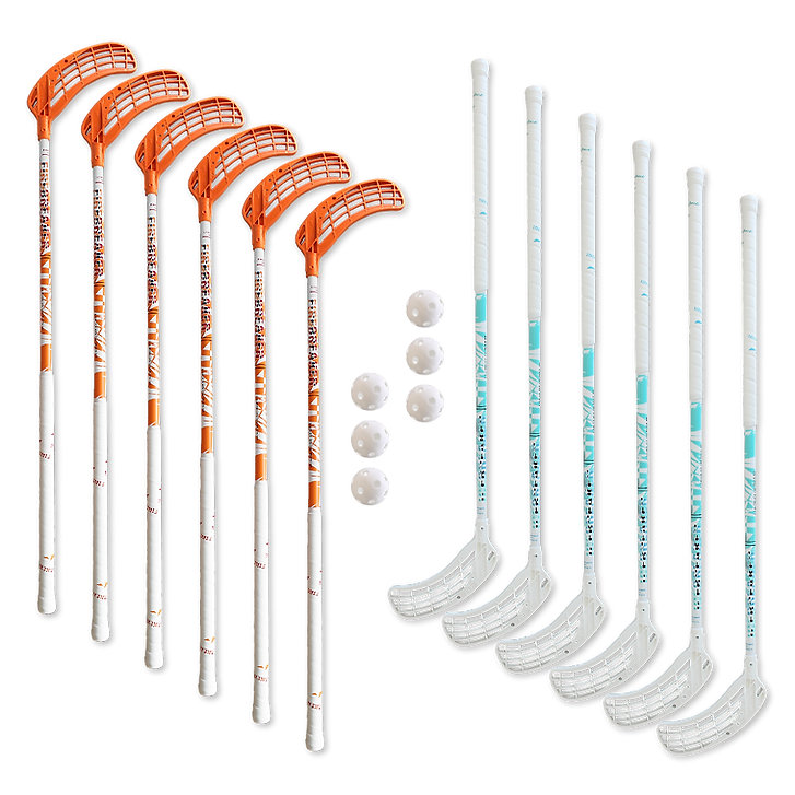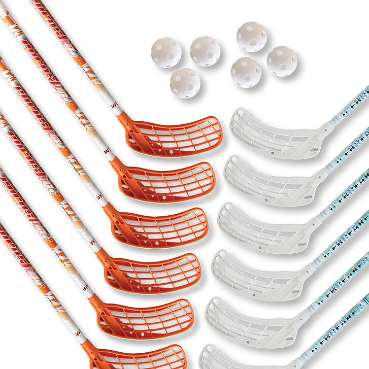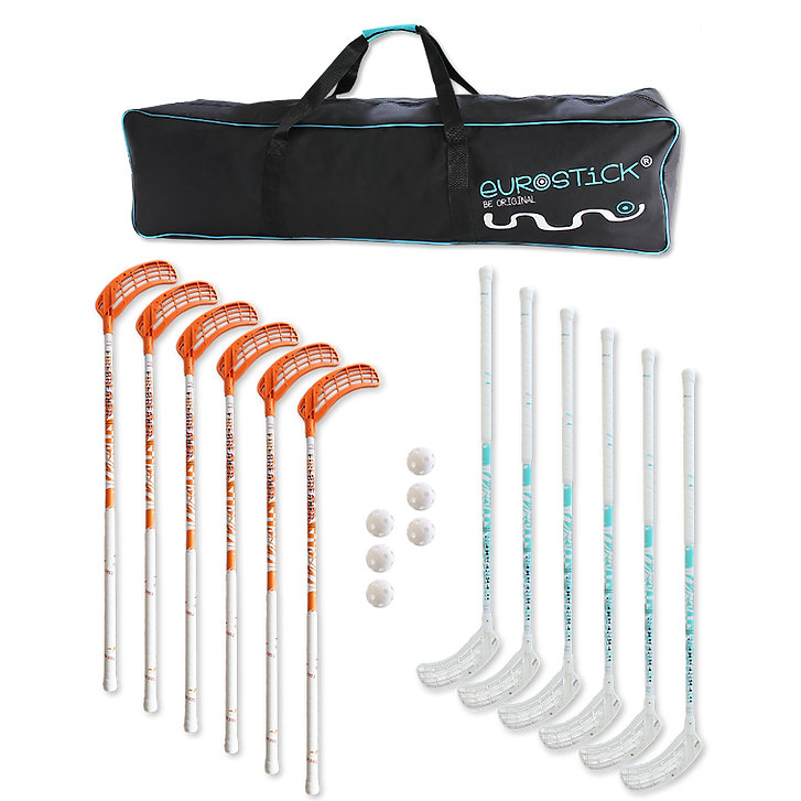 Set mit 12 Unihockeyschlägern und 6 Bällen mit praktischem Rucksack.